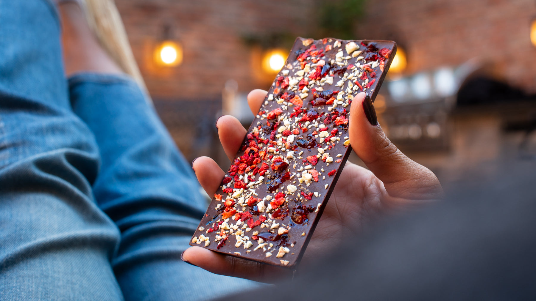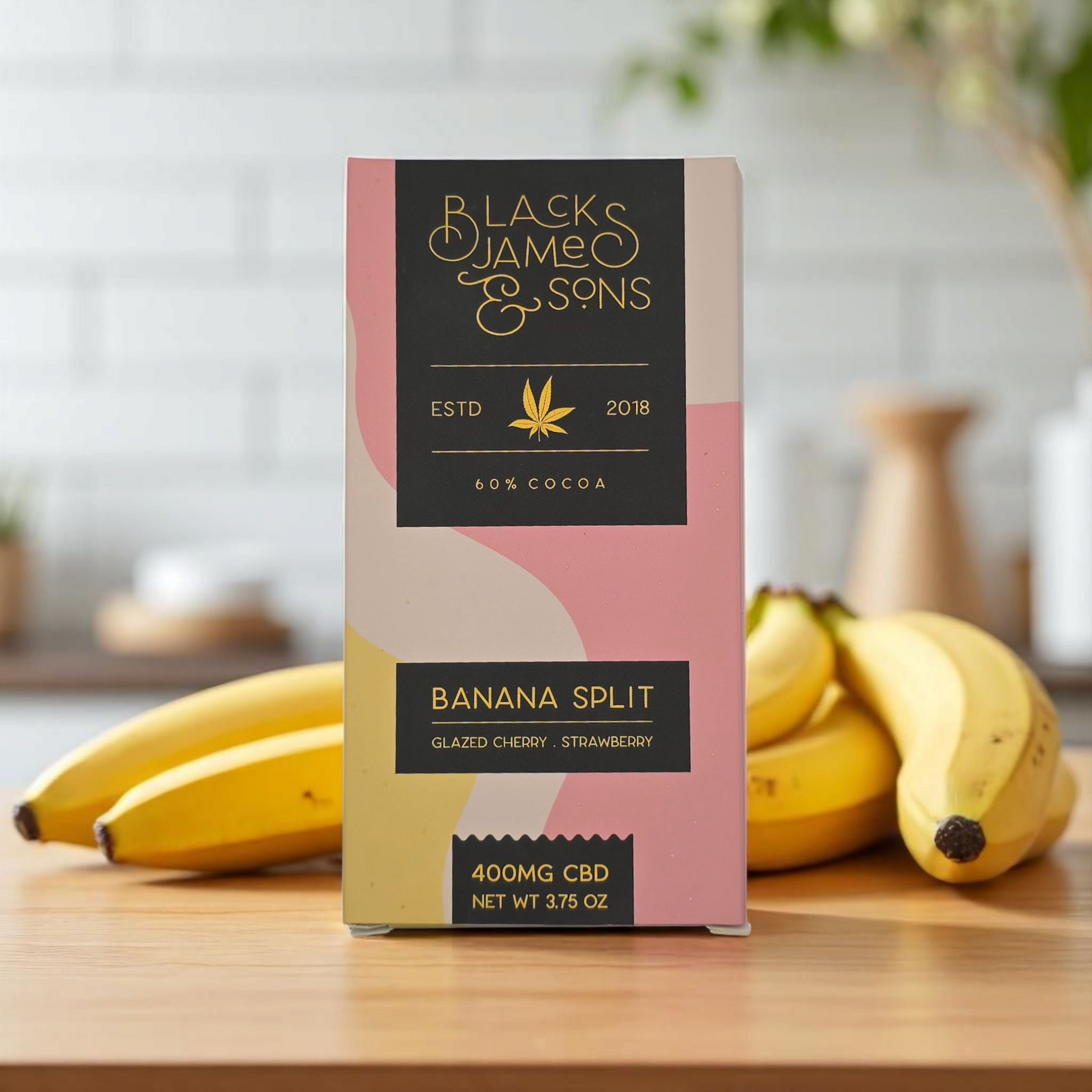 Meet Banana Split Fantasy—a gourmet twist on the iconic dessert. Crafted with velvety Callebaut 60% dark chocolate and infused with 400mg of premium CBD, this handcrafted 80g bar is topped with freeze-dried strawberries, freeze-dried bananas, and glazed cherries. Sweet, fruity, and luxurious—each bite evokes nostalgia wrapped in indulgence.