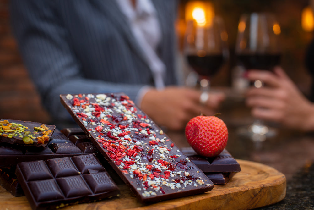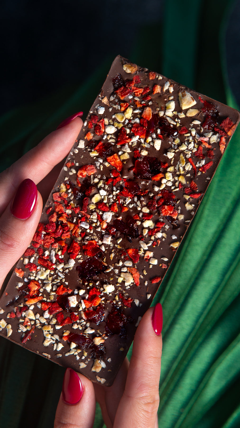 Callebaut 60-40-38 Dark Chocolate, Freeze-Dried Strawberries, Freeze-Dried Bananas, Glazed Cherries, 400mg Premium CBD.