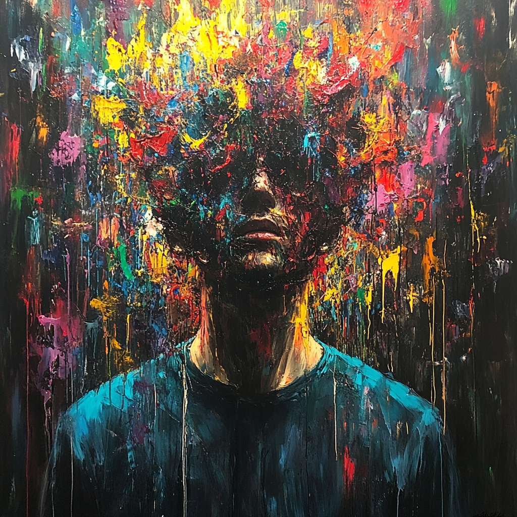 A visual study in emotional entropy, Fragments of Despair captures the experience of internal collapse rendered in explosive color. Equal parts breakdown and revelation, this piece balances abstract violence with compositional precision—a portrait of struggle dissolving into chaotic beauty.